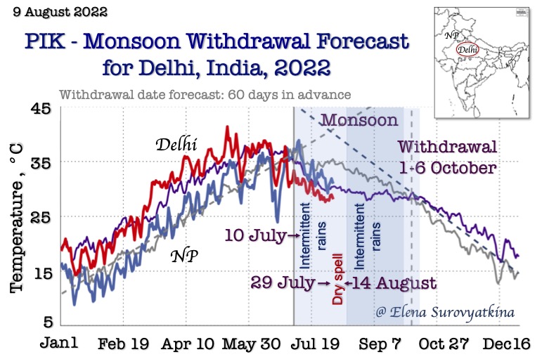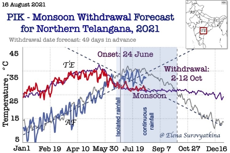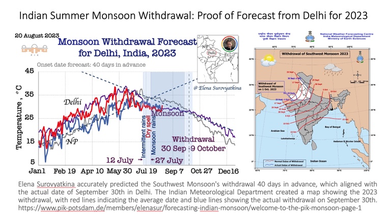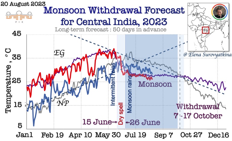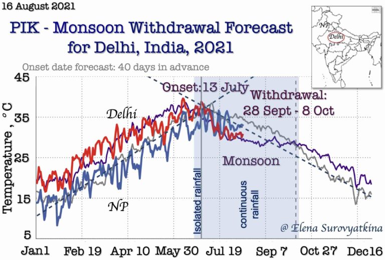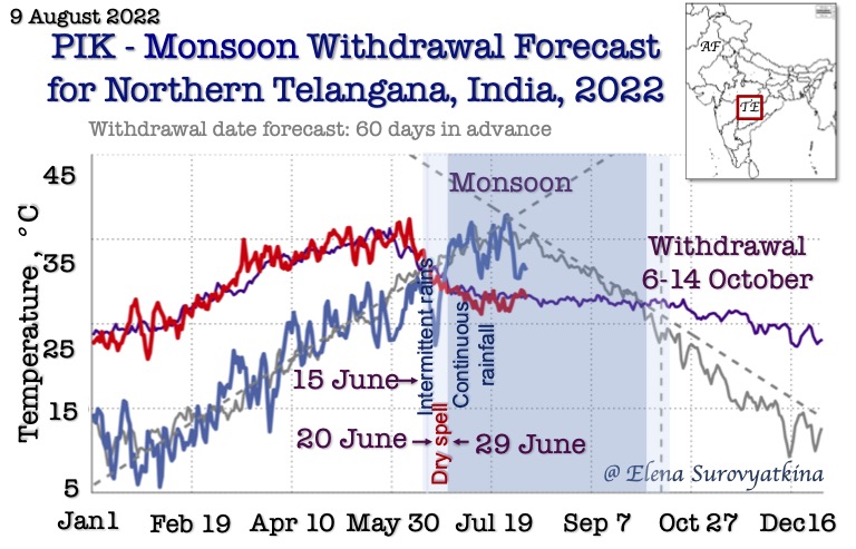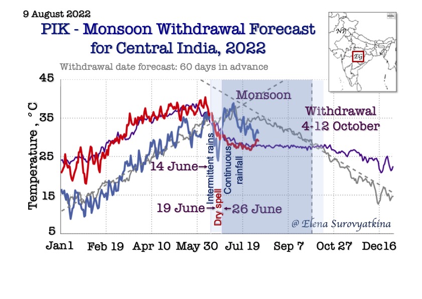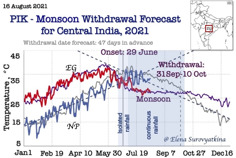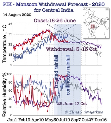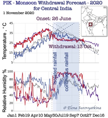 Our earliest forecast (70 days in advance) is the only one available the Central part of India. Our goal is to provide farmers, agriculture companies, managing water, and energy resources and other stakeholders from national to local levels with the information on the monsoon withdrawal dates with the aim of minimizing regional risks of the Indian population vulnerability from climate-related phenomena.