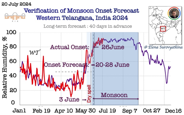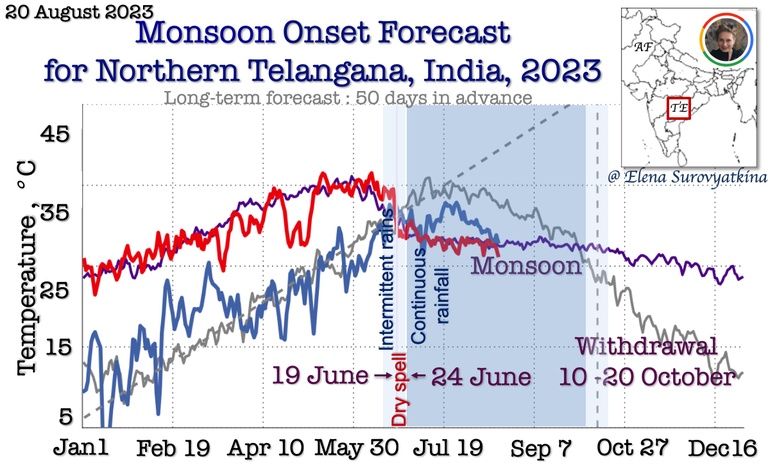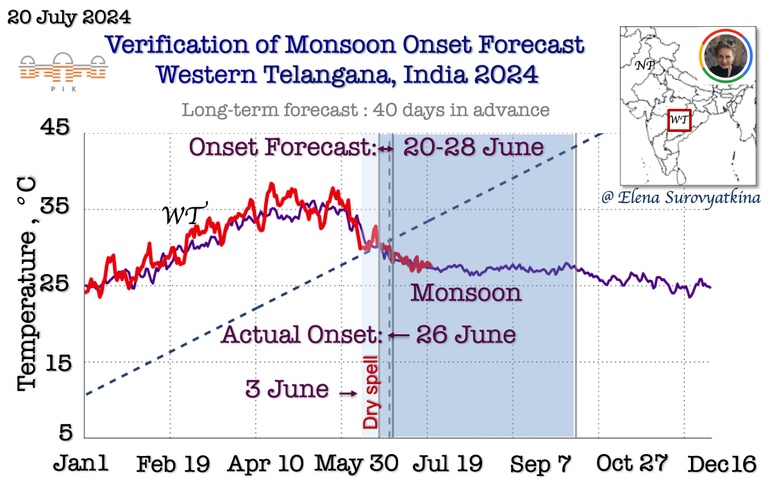 Daily mean near-surface air temperature till July 20, 2024, for Western Telangana (red). For reference, the purple line is past the 5-year average for the same regions. The dashed line shows the boundary between pre-monsoon and monsoon. Once the temperature drops below the dashed line, monsoons start inevitably. I forecasted monsoon onset to arrive in Western Telangana between June 20 and 28. Additionally, I forecasted the appearance of a dry spell after June 3, before monsoon onset. The southwest monsoon arrived in Western Telangana on June 26, 2024, precisely according to a schedule that I had forecasted.