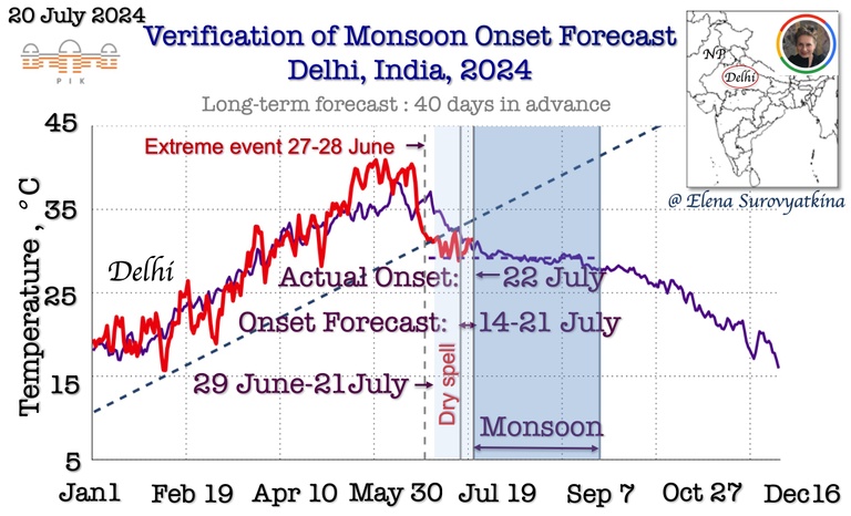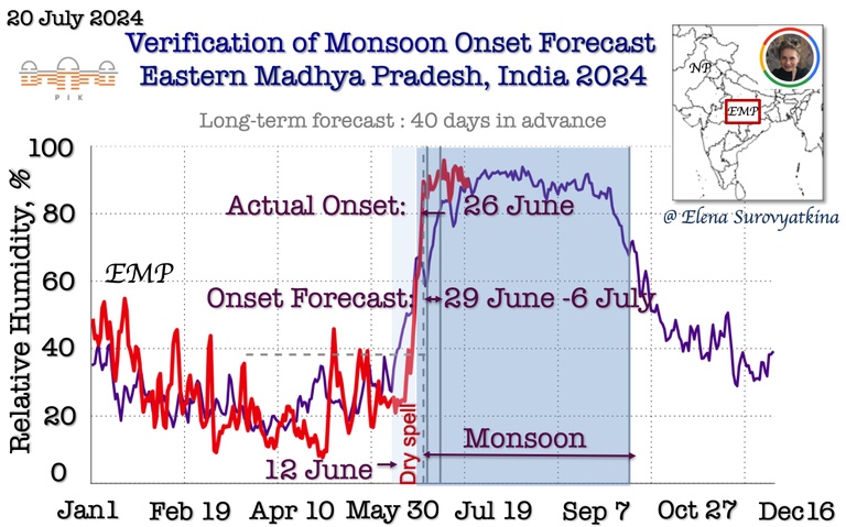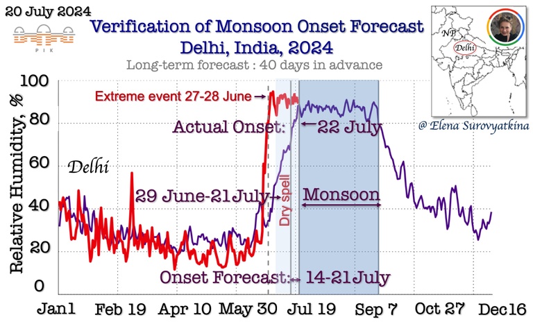 In Eastern Madhya Pradesh (EMP), the monsoon established itself on June 26, three days earlier than the predicted window of June 29 to July 6 and three weeks later on July 22 in Delhi, one day later than predicted. The evidence from observational data unambiguously supports the forecasts of delayed monsoon onset made on May 8, 2024, more than 40 days in advance (and, in fact, 50 days) and remained unchanged since the initial forecast with acceptable minor deviations.