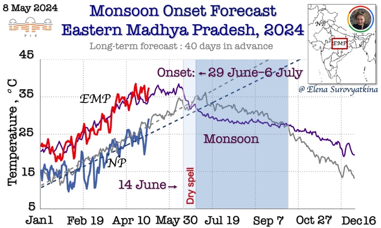To make predictions of monsoon timing, we apply our recently developed method [Stolbova V. et.al, 2016] which focuses on Tipping elements of the Indian monsoon – the Eastern Ghats (EG) and North Pakistan (NP).