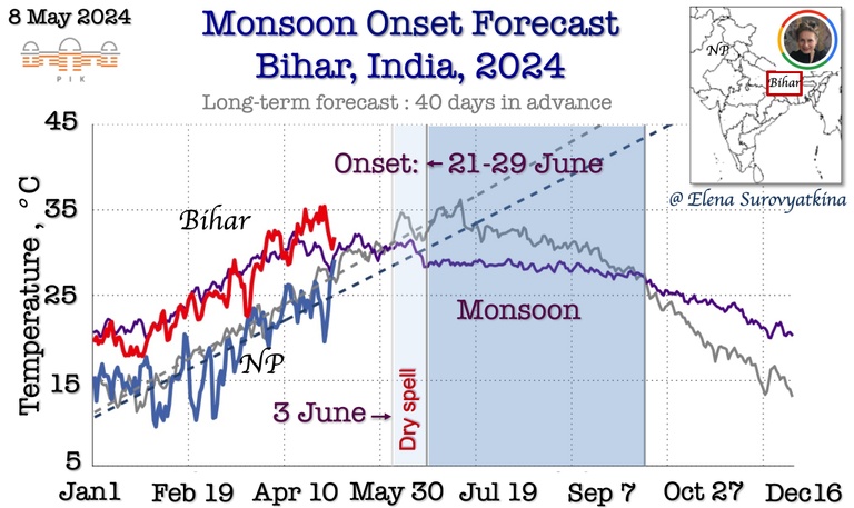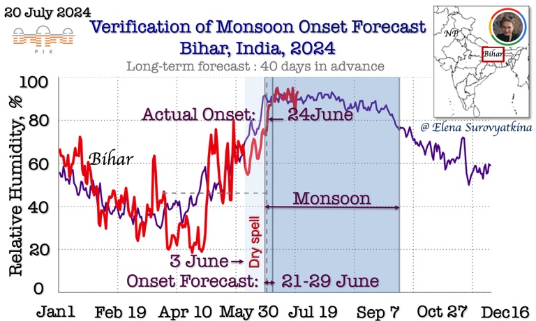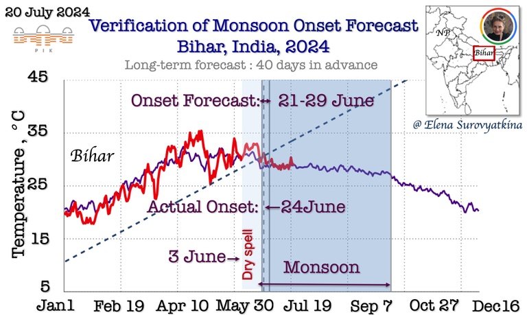 Daily mean near-surface air temperature till July 20, 2024, for Bihar (red). For reference, the purple line is past the 5-year average for the same regions. The dashed line shows the boundary between pre-monsoon and monsoon. Once the temperature drops below the dashed line, monsoons start inevitably. I forecasted monsoon onset to arrive in Bihar between June 21 and 29. Additionally, I forecasted the appearance of a dry spell after June 3, before monsoon onset. The southwest monsoon arrived in Central India on June 24, 2024, precisely according to a schedule had forecasted.