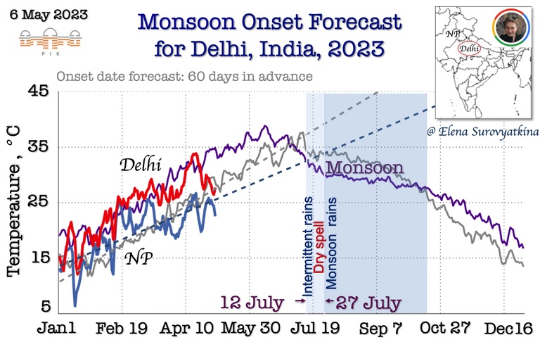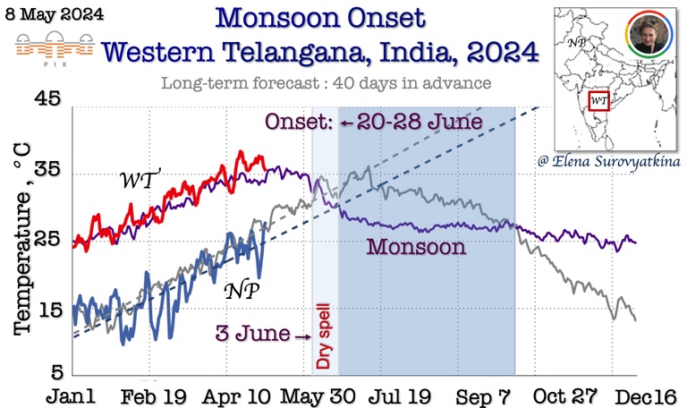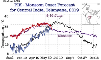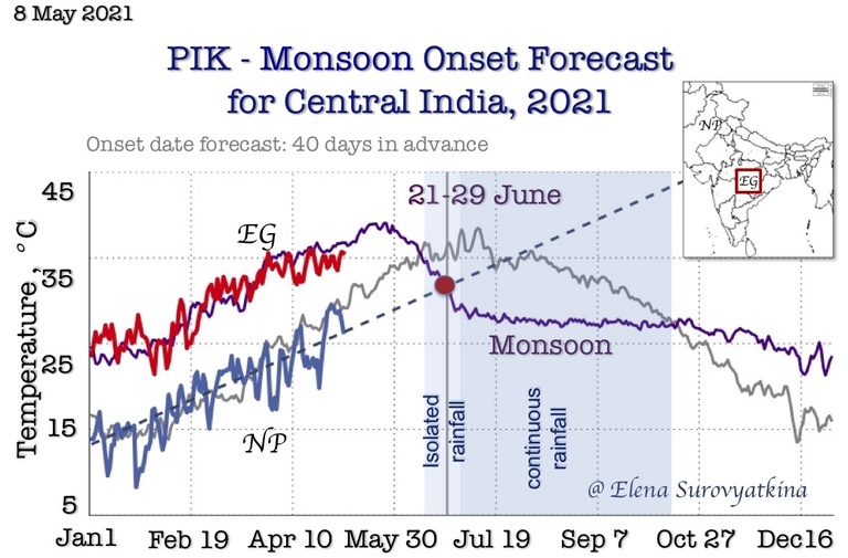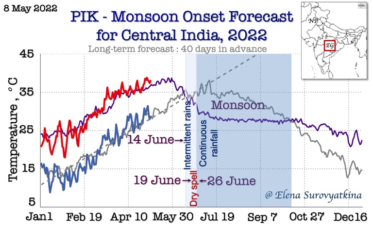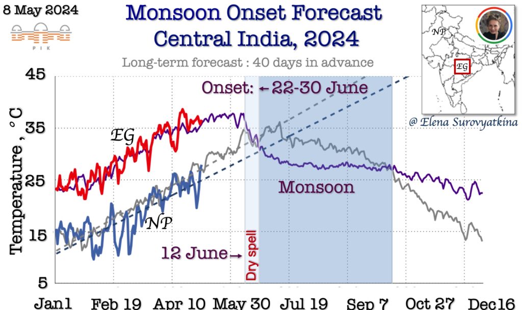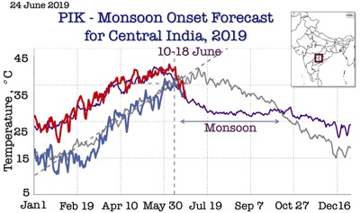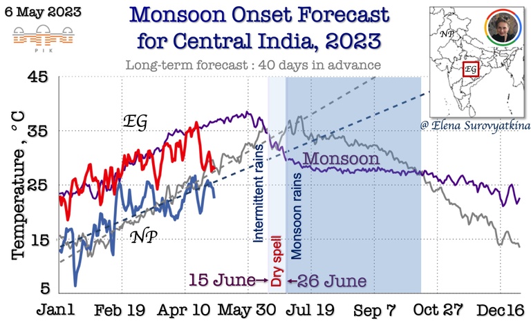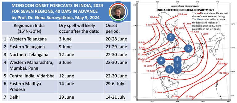For the first time, I am issuing a forecast for the monsoon onset in seven regions to schedule the advancement of the monsoon. Over eight years of experience reliably forecasting monsoons in Central India (see results at the end of the news) encourage me to take this step forward. This is a big scientific challenge that has never been done before, but we need to start doing it.