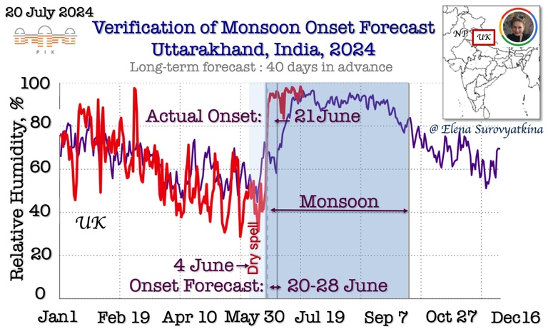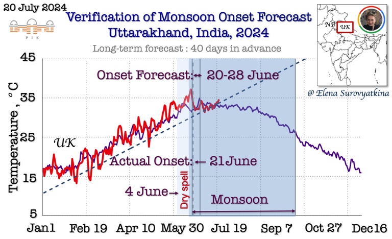 Daily mean near-surface air temperature till July 20, 2024, for Uttarakhand (red). For reference, the purple line is past the 5-year average for the same regions. The dashed line shows the boundary between pre-monsoon and monsoon. Once the temperature drops below the dashed line, monsoons start inevitably. I forecasted monsoon onset to arrive in Bihar between June 20 and 28. Additionally, I forecasted the appearance of a dry spell after June 3, before monsoon onset. The southwest monsoon arrived in Uttarakhand on June 21, 2024, precisely according to a schedule had forecasted.