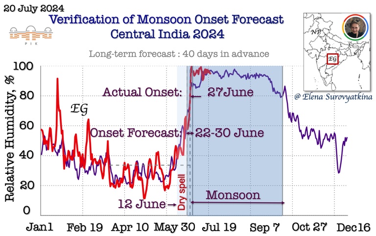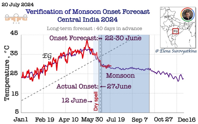 Daily mean near-surface air temperature till July 20, 2024, for Central India(red). For reference, the purple line is past the 5-year average for the same regions. The dashed line shows the boundary between pre-monsoon and monsoon. Once the temperature drops below the dashed line, monsoons start inevitably. I forecasted monsoon onset to arrive in Central India between June 22 and 30. Additionally, I forecasted the appearance of a dry spell after June 12, before monsoon onset. The southwest monsoon arrived in Central India on June 27, 2024, precisely according to a schedule that I had forecasted.