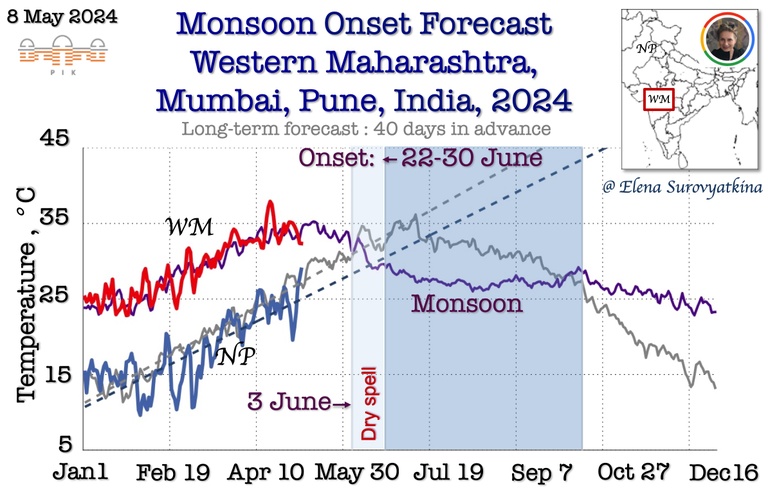 4. Daily mean near-surface air temperature till May 5, 2024, for Western Maharashtra, Mumbai, Pune (red) and North Pakistan (blue). Violet and grey lines are past the 5-year average for the same regions. Dry spell will likely occur after June 3rd, and the monsoon onset is expected between June 22-30.