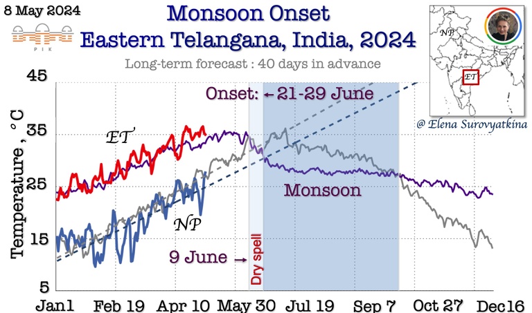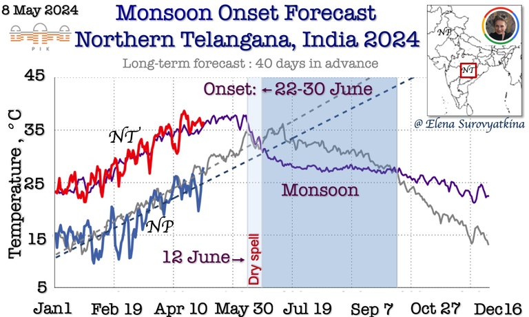 3. Daily mean near-surface air temperature till May 5, 2024, for Northern Telangana (red) and North Pakistan (blue). Violet and grey lines are past the 5-year average for the same regions. Dry spell will likely occur after June 12th, and the onset of monsoon is expected between June 22-30.