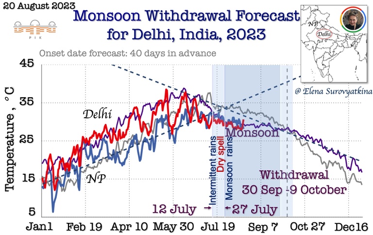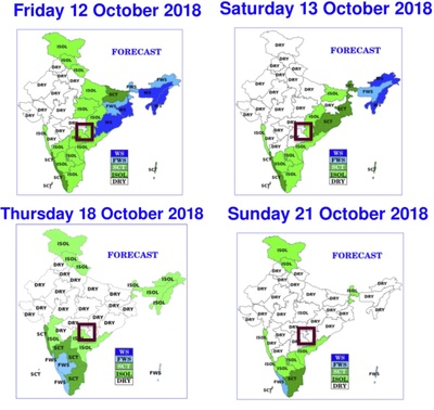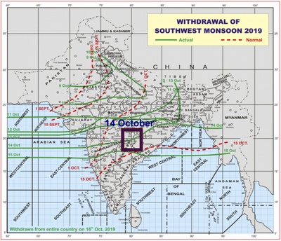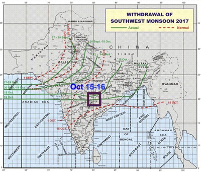 In the first decade of October, namely between 2nd-6th of October, it seemed that the rainy season is over for whole Northern part of India, and the Monsoon quickly left in the English way without saying goodbye. This is why the withdrawal line appeared on the Map of Withdrawal Southwest of Monsoon at 16°N on October 6 (http://www.imd.gov.in/pages/monsoon_main.php). Does it mean, predicting withdrawal between 13 and 23 of October, I have missed?