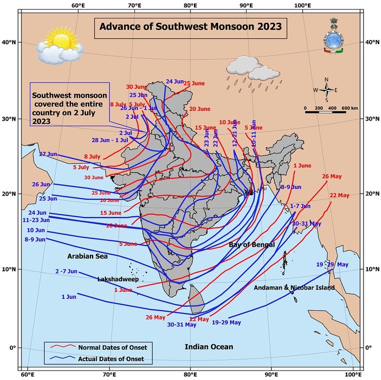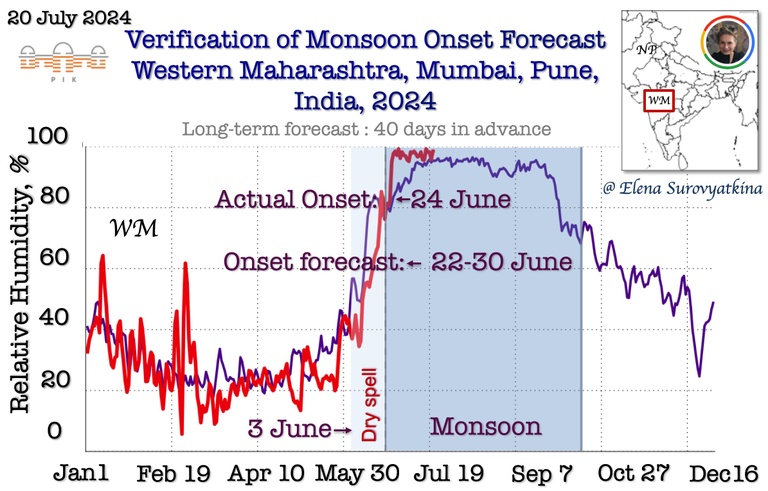 The monsoon onset dates in 12 states in India, confirmed by temperature and relative humidity data, indicate a delayed monsoon in the central part of India. And this delay was resolved by well-organized and sustained rainfall from June 21 to June 27, marking the beginning of the rainy season. Furthermore, there was a considerable delay in the monsoon onset in Eastern Rajasthan and Delhi, where the monsoon commenced only on July 16 and July 22 respectively. These observations are consistent with the forecasts I made 50 days in advance.