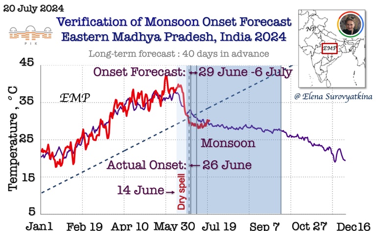 Daily mean near-surface air temperature till July 20, 2024, for Eastern Madhya Pradesh (red). For reference, the purple line is past the 5-year average for the same regions. The dashed line shows the boundary between pre-monsoon and monsoon. Once the temperature drops below the dashed line, monsoons start inevitably. I forecasted monsoon onset to arrive in Eastern Madhya Pradesh between June 29 and July 6. Additionally, I forecasted the appearance of a dry spell after June 14, before monsoon onset. The southwest monsoon arrived in Eastern Madhya Pradesh on June 26, 2024; three days earlier to the schedule that I had forecasted.