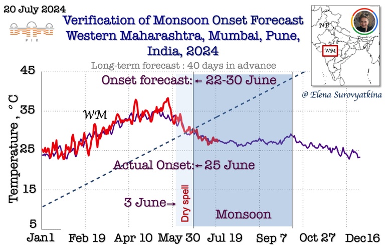 Daily mean near-surface air temperature till July 20, 2024, for Western Maharashtra (red). For reference, the purple line is past the 5-year average for the same regions. The dashed line shows the boundary between pre-monsoon and monsoon. Once the temperature drops below the dashed line, monsoons start inevitably. I forecasted monsoon onset to arrive in Western Maharashtra between June 22 and 30. Additionally, I forecasted the appearance of a dry spell after June 3, before monsoon onset. The southwest monsoon arrived in Western Maharashtra on June 25, 2024, precisely according to a schedule I had forecasted.