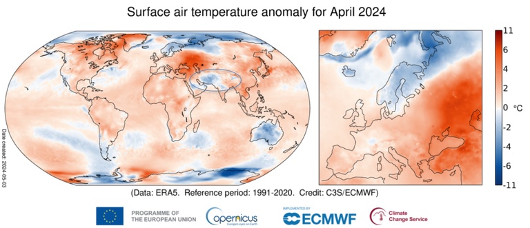 Surface air temperature anomaly for April 2024 relative to the April average for 1991-2020. Data source: ERA5. Credit: Copernicus Climate Change Service/ECMWF.