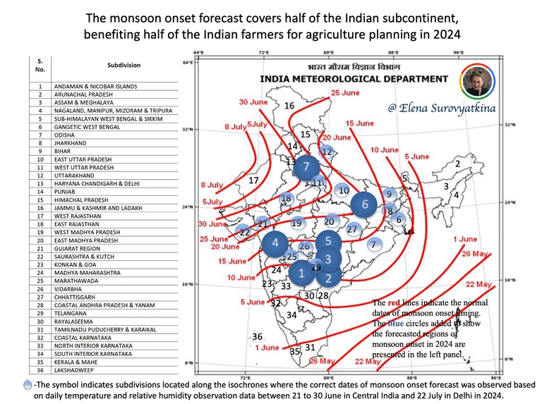 I announced the monsoon forecast for seven regions on May 10, and then I received many requests from India, especially regarding agriculture. In response, I adapted my research, originally planned for seven regions, to include the central and northern parts of India. This adaptability allowed me to make forecasts for twelve states of India. Below, you will find the verification of the monsoon onset forecast in these states, a testament to the flexibility of my method.