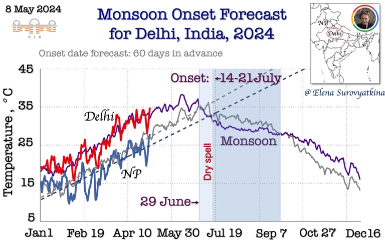7. Daily mean near-surface air temperature till May 5, 2024, for Delhi (red) and North Pakistan (blue). Violet and grey lines are past the 5-year average for the same regions. Dry spell will likely occur after June 29th, and the monsoon onset is expected between July 14 – July 21.