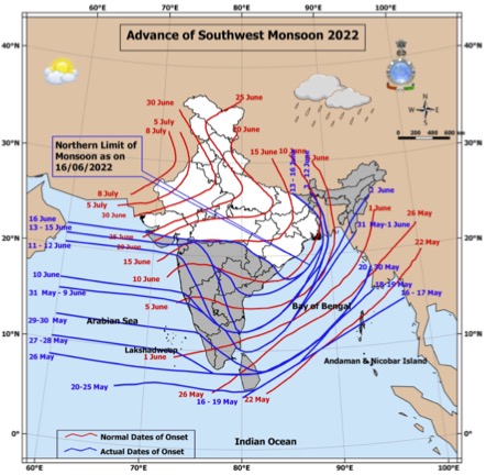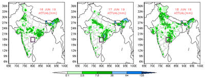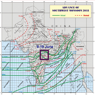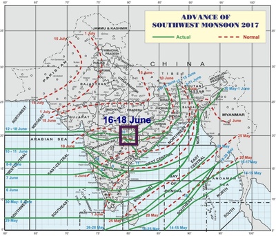 The red lines show an average date of a long history of monsoon timing considered by the IMD as a normal. The green curves indicate the northern most limits of monsoon (NLM) up to which it has advanced on any given day. See the last green line – the position of NLM on 16th-18th June, which crossed our region of the forecast. That means the monsoon advanced up to the central part of India.