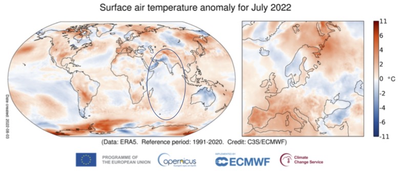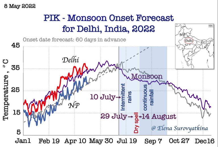 One of the reasons for the delayed monsoon season is the negative anomaly of temperature over central and especially northern parts of India from March to April, as shown on the map. Thus, it will push the onset of the monsoon season to the end of June.