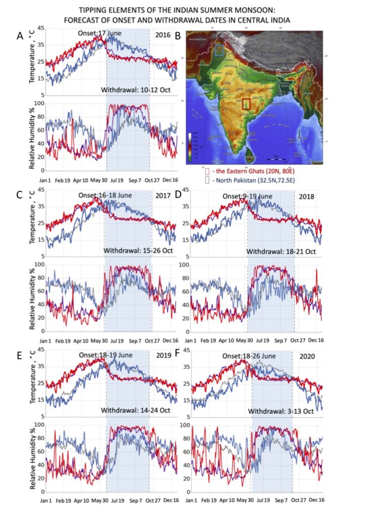 We forecasted the monsoon withdrawal from the Eastern Ghats on the 5th of October with a deviation of +/-5 days. We delivered this prediction on July 27-th, 2016, namely 70 days in advance. The actual monsoon withdrawal started on October 10-th when the relative humidity in the region started to decrease, then it passed the 80 percent threshold, and a transition back to a monsoon became impossible, meteorological stations registered it also, and on October 12-th meteorological stations reported ‘No rain’ in the EG and also in areas located across the subcontinent in the direction from the North Pakistan to the Bay of Bengal. Hence, the date of monsoon withdrawal – October 10-th, predicted 70 days in advance, lies within our prediction interval.
