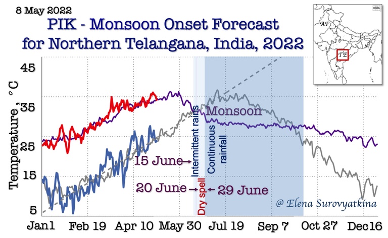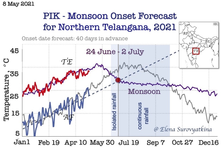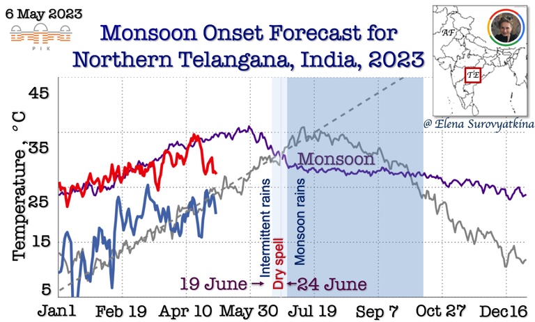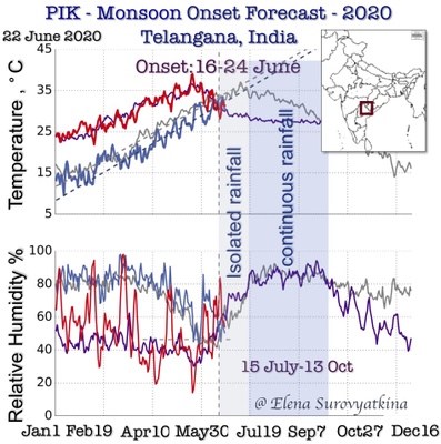Even so, those two regions, Eastern Ghats and Telangana, are neighbouring; there is a considerable difference in the interplay of the two branches of Monsoon (one from the Arabian Sea and another from the Bay of Bengal) in these regions. In some years, monsoon onset appears at the same date in these two areas, while in other years it appears – with a difference of 6-10 days. Such a difference might be caused by the simultaneous appearance of two cyclones in the Arabian Sea and in the Bay of Bengal, which prevent the advance of monsoon for several days. Another reason might be an anticyclone on the north of the Arabian Sea, which decelerates the turning of the Monsoon winds in the Bay of Bengal toward Indian subcontinent. These synoptic events are impossible to predict well in advance and it could be forecasted near the date of its appearance only. This is why the forecast in Telangana region is challenging. In such a case the Indian Meteorological Department track cyclones perfectly that helps me to update a monsoon onset date in June, on the eve of monsoon. We are collaborating with the Indian Meteorological Department and our forecasts complement each other. We are working together to improve climate resilience by building new capacities via the early forecast of monsoon.