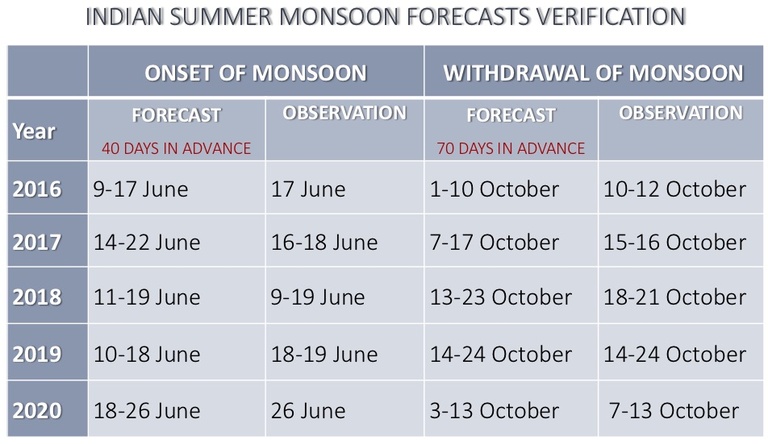 The long-range forecast of the onset and withdrawal dates of monsoon rainfall is critical for taking appropriate decisions at various levels from farmer’s field (e.g. a choice of plowing and seeding days) to the central government (e.g. managing water and energy resources, food procurement policies and trade etc.).