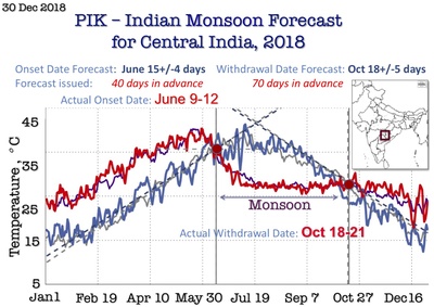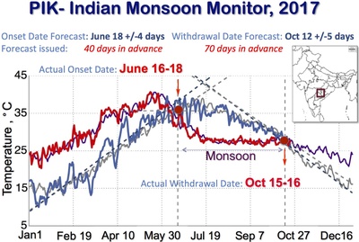 The prior knowledge of dates of onset and withdrawal of monsoon is of vital importance for the population of the Indian subcontinent. In May 2016 before monsoon season, India recorded its highest-ever temperature of 51C. Hot waves have decimated crops, killed livestock and left 330 million people without enough water. At the end of monsoon season the floods in Indian this year have also broken previous records. Severe and devastating rainfall poured down, triggering dams spilling and floods. Such extreme conditions pose the vital questions such as: When will the monsoon come? When will the monsoon withdraw?