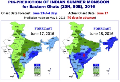 We predicted the monsoon arrival to the Eastern Ghats (20N,80E) on the 13th of June with a deviation of +/-4 days. The prediction was made on May 6-th, 2016, that is 40 days in advance of the date of the forecast. The actual monsoon arrival was June 17-th. In this day near-surface air temperature and relative humidity overcame the critical values and the monsoon season started, that was confirmed by observations of meteorological stations located around the EG-region.