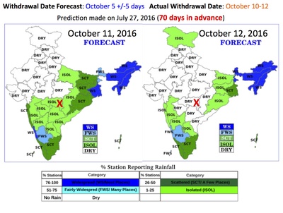 The Indian Summer Monsoon (the Southwest Monsoon) has withdrawn from the Central part of India (20N, 80E) 15th-16th October 2017. We issued our forecast on July 30, 2017, that the monsoon will withdraw from the Central part of India around 12th October (+/- 5 days), namely between 7th and 17th October 2017. Hence, our earliest forecast of the withdrawal date made 70 days in advance was correct.