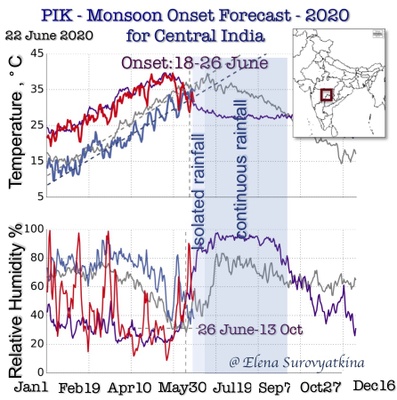 Our next forecast for the monsoon withdrawal date from the central part of India will be issued on July 27-th. The PIK-monitor will be updated twice a week to show how far away we are from the Monsoon withdrawal day. Follow our updates.