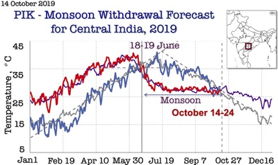 The PIK- monsoon onset monitor shows how far away we are from the Monsoon withdrawal day. Daily mean near-surface air temperature till October 22, 2017, for the Eastern Ghats (red) and North Pakistan (blue).Violet and gray lines- past 5-years average for same regions.The tipping point (red) indicates the critical temperature and the forecasted onset date. The forecasted withdrawal dates are from 7th to 17th October. The data at the PIK-monitor will be updated twice a week. Follow our updates.