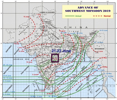 The Map of Advance of Southwest Monsoon across India on June 19th provided by the Indian Meteorological Department.